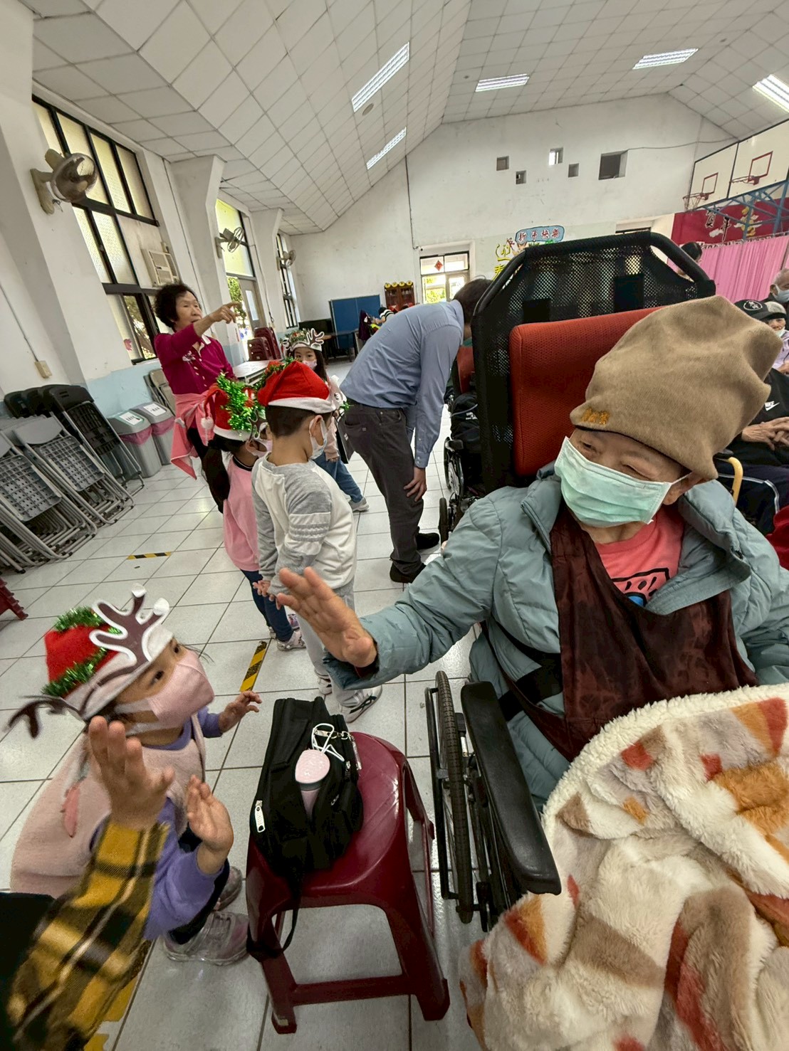 當小朋友們踏著輕快的步伐走進活動會場,現場瞬間洋溢著溫暖的氣息。長輩們的臉上彷彿被點亮般綻放出幸福的笑容,彷彿回到童年時光,看著孩子們載歌載舞,許多長輩也不由自主地隨著節奏揮動雙手,輕敲手中的鈴鼓,氣氛熱鬧歡騰、充滿愛與歡樂。💃🕺